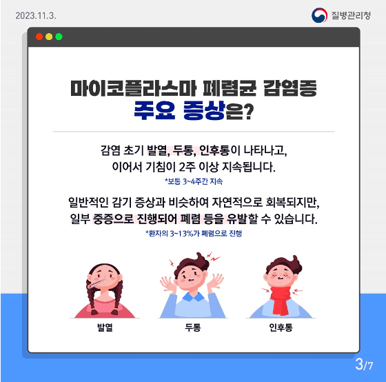 마이코플라스마균이 호흡기를 통해 들어와서 발생하는 급성 호흡기 감염증입니다.