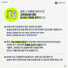 | 병원 입원 예정 환자 | - 병원에서 검사 - PCR 무료 - 신속항원검사 50% 본인 부담(응급실, 중환자실 입원만 지원) |