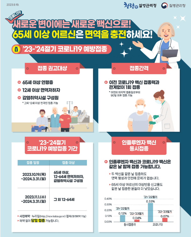 65세 이상, 12세 이상 면역저하자, 감염취약시설 구성원, 고위험군 소아 및 영유아는 접종 권고 대상입니다.